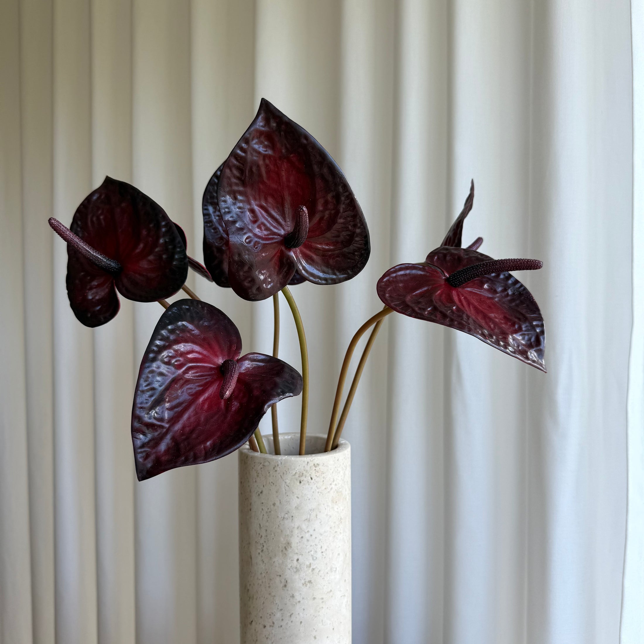 Den mørkerøde anthurium passer perfekt ind i både moderne og klassiske indretninger – smuk alene i en vase eller kombineret med andre kunstige blomster for et mere fyldigt og dekorativt udtryk.