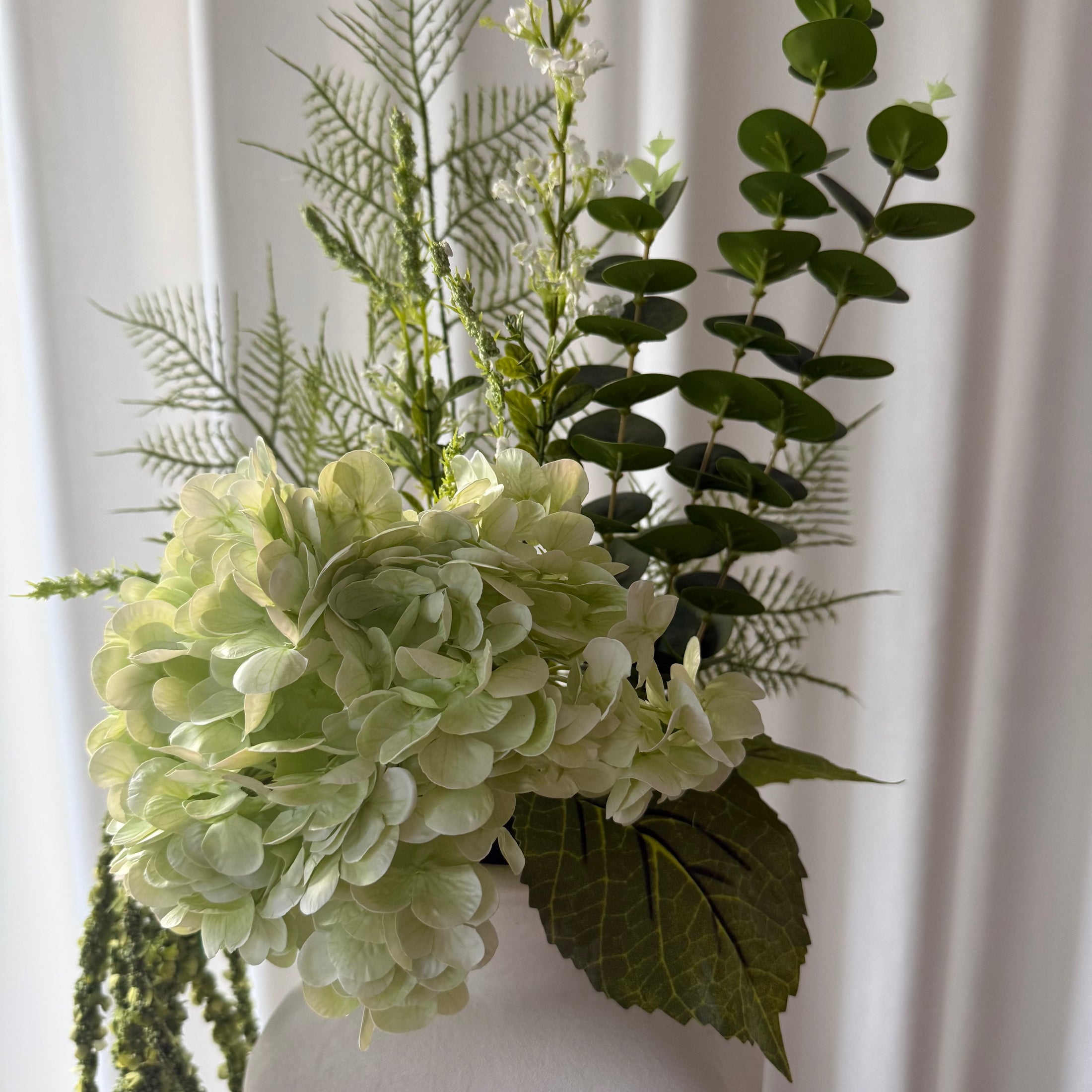 En frisk og naturlig buket i grønne nuancer! Denne smukke sammensætning kombinerer bløde hortensiaer, lette eukalyptusgrene, fin salvia og grønne bregner med amaranthus, som giver både fylde og liv. Perfekt til at skabe ro og naturlig skønhed i hjemmet eller som en særlig gave til nogen, du holder af.