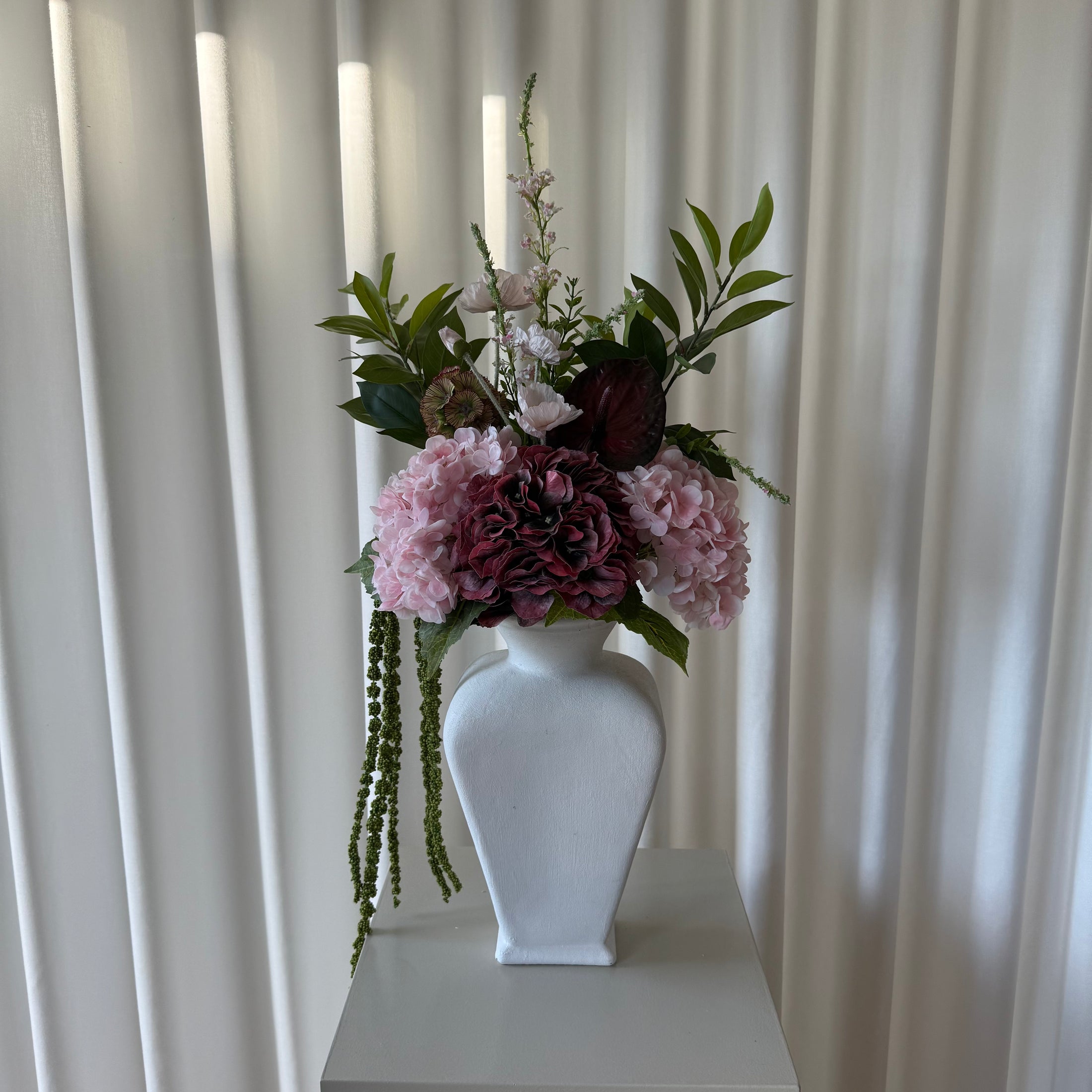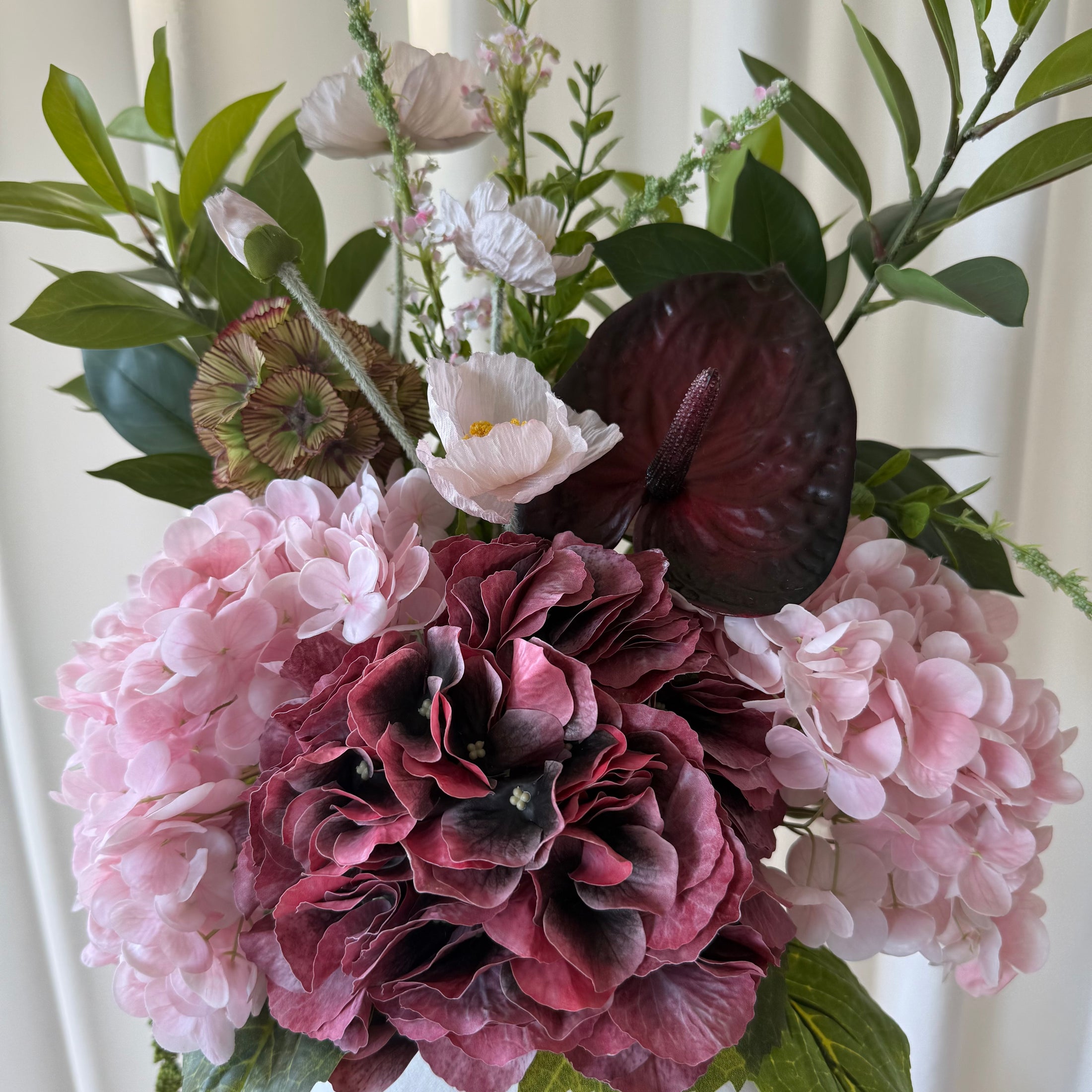 En fyldig og elegant buket i bordeaux, lyserød og grønne nuancer! Denne smukke sammensætning kombinerer hortensiaer i bordeaux og lyserød, eksotisk mørkerød anthurium, lyse pastel poppy-blomster, scabiosa, salvia og amaranthus, suppleret med friske grønne blade, som skaber en harmonisk og livfuld buket med dybde og karakter. Perfekt til at sprede varme og elegance i hjemmet eller som en særlig gave, der imponerer.