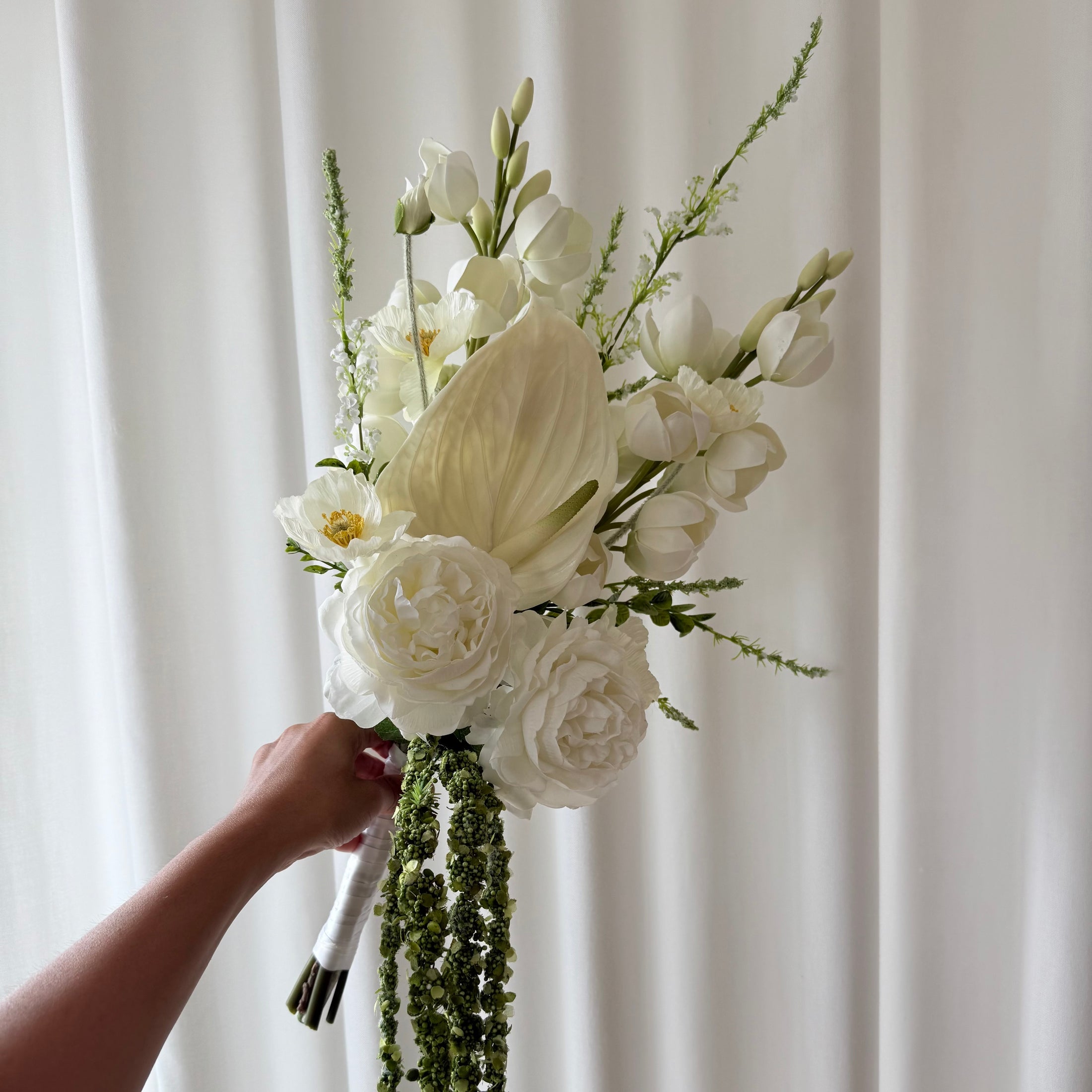 Sig ja til en brudebuket, der aldrig visner. Vores brudebuketter er lavet af smukke, naturtro kunstige blomster, som holder for evigt. De er det perfekte minde fra din store dag – elegant, romantisk og tidløst. Ønsker du en helt speciel buket? Du kan altid skrive til os for at finde den perfekte løsning til din store dag.
